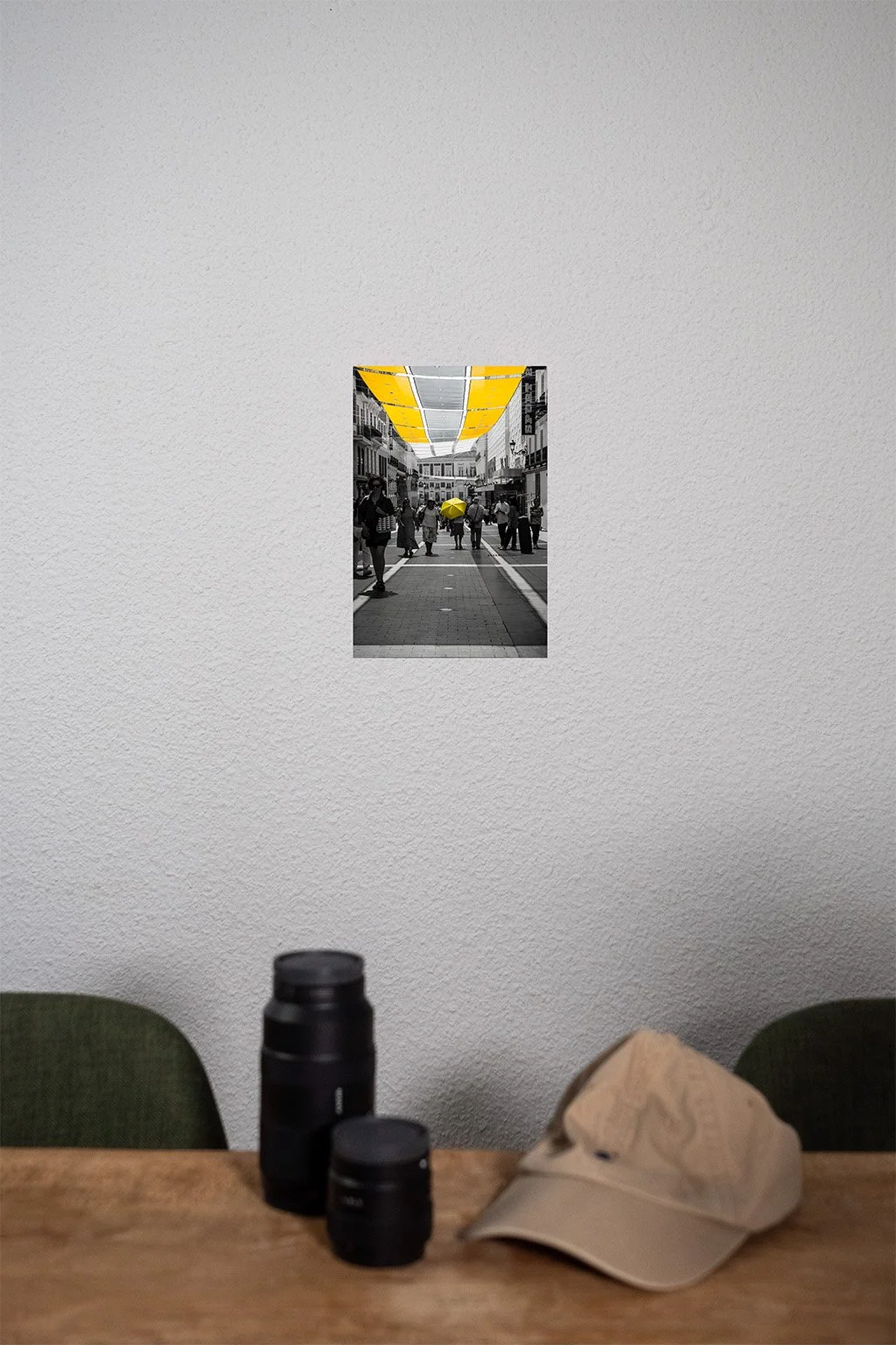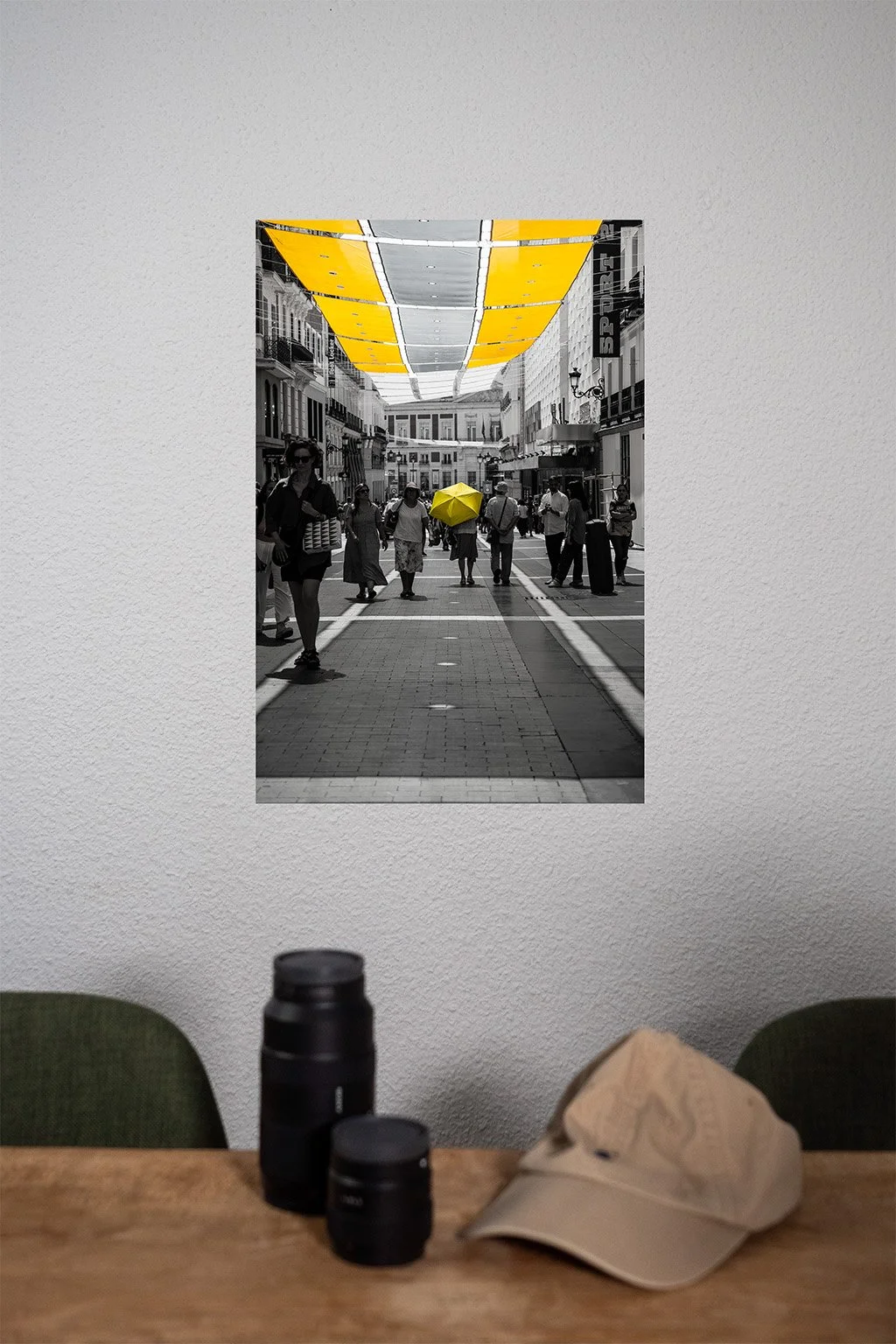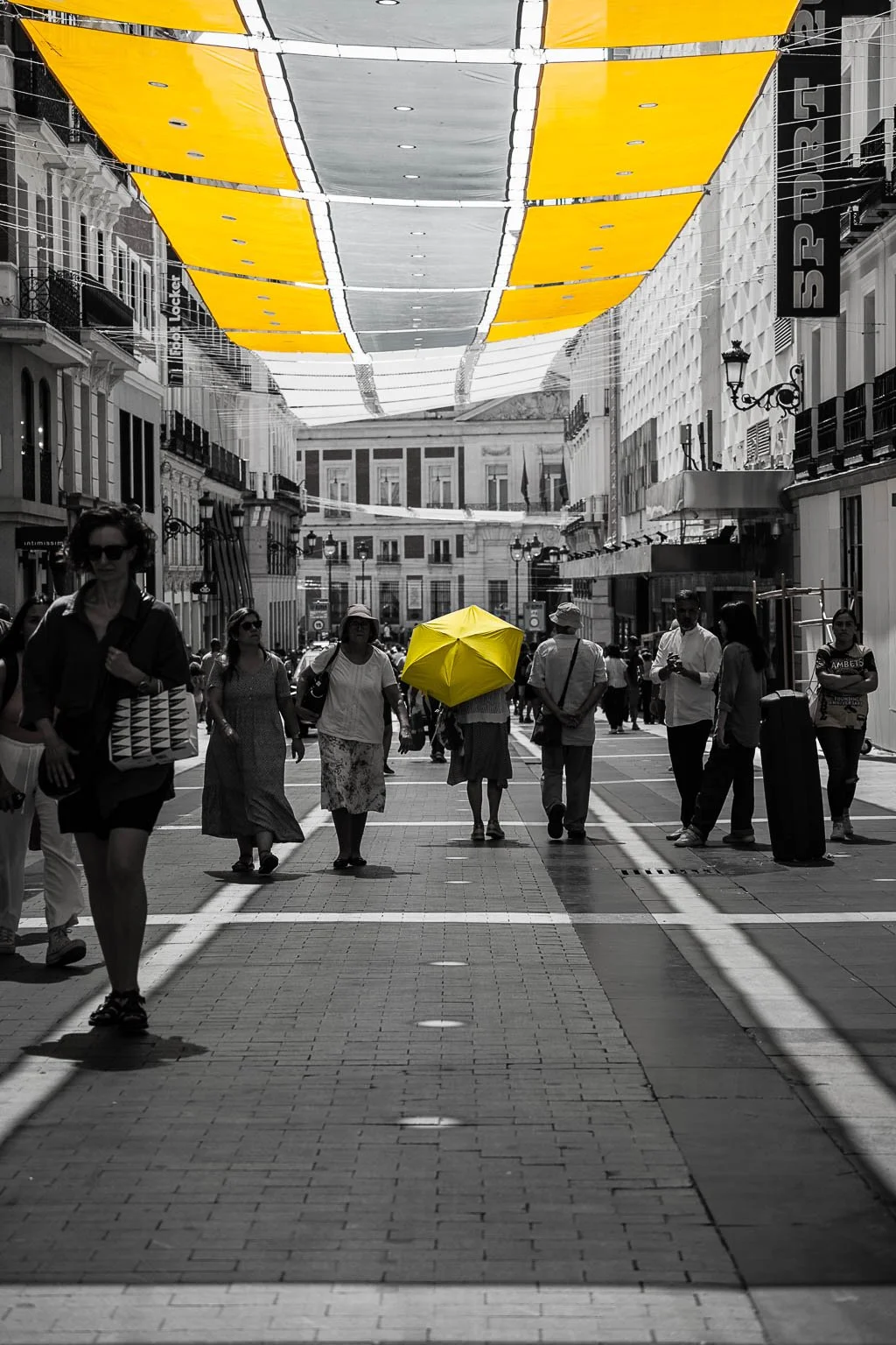 Striking black and white street photography featuring a vivid yellow umbrella in a bustling European cityscape. This fine art print captures the essence of individuality and contrast, with selective color highlighting the lone figure beneath a canopy of yellow fabric. Perfect for modern interiors, urban art lovers, and collectors of minimalist yet emotionally resonant photography. Available in high-resolution prints for home or office decor.